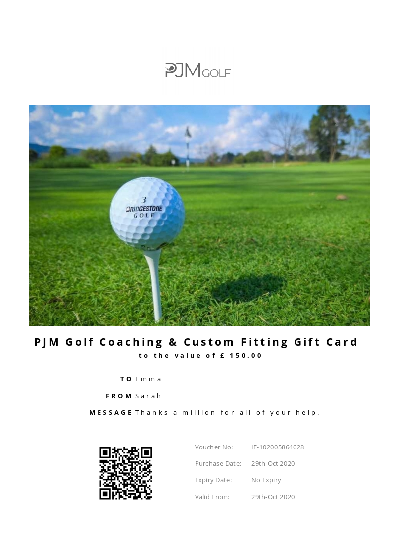 PJM Golf Coaching & Custom Fitting allows you to purchase instantly printable gift vouchers, special offers and tickets using the Voucher Connect platform.